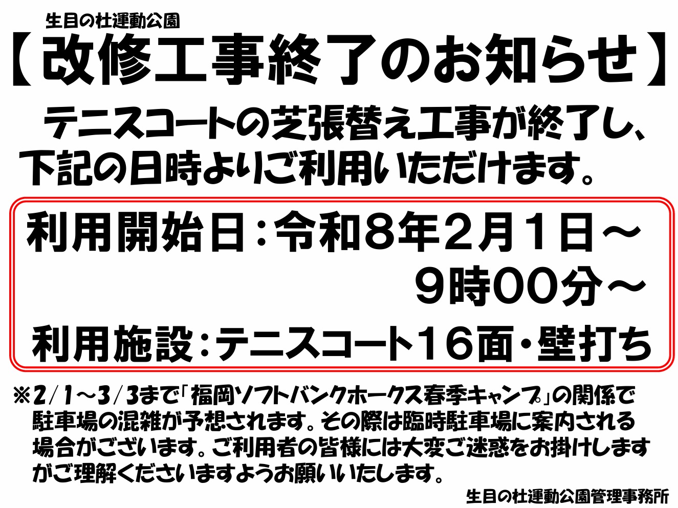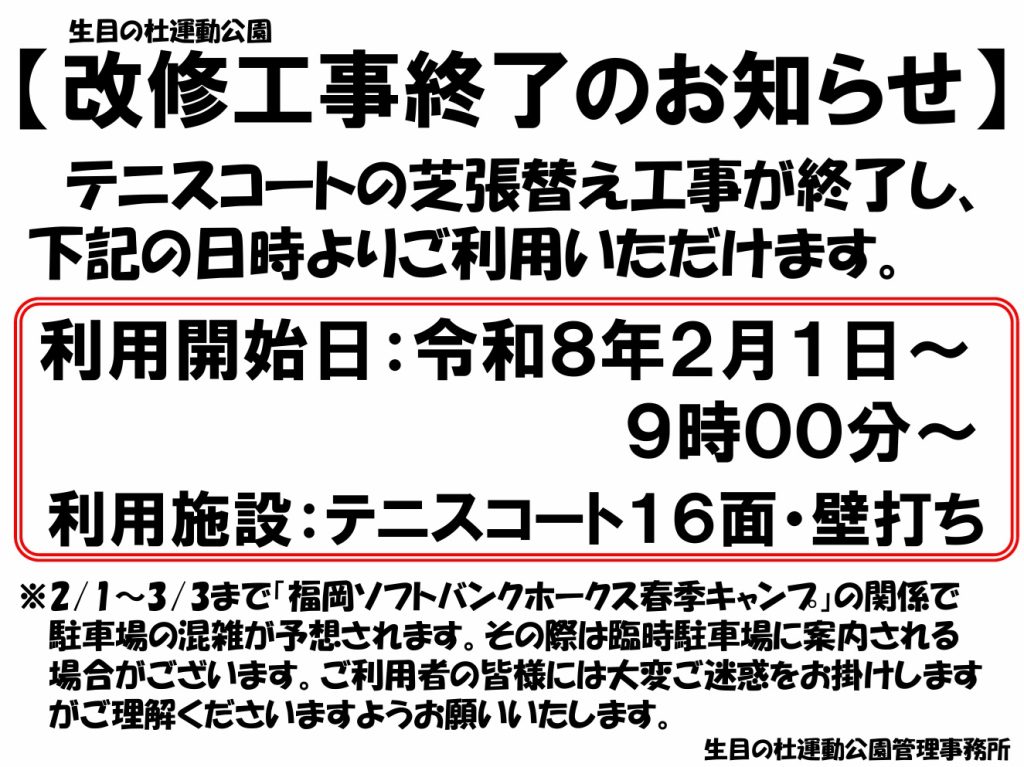 テニスコート 利用開始のお知らせ 令和8年2月1日(日) 9時00~