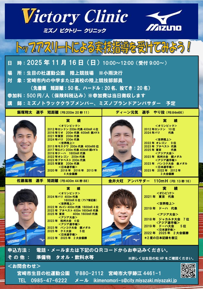 11/16(日) 「ミズノビクトリークリニックin生目の杜」を開催いたします。