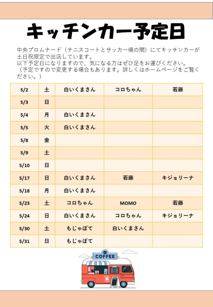 生目の杜運動公園、中央プロムナード付近に土日祝メインでキッチンカーが来園しております。