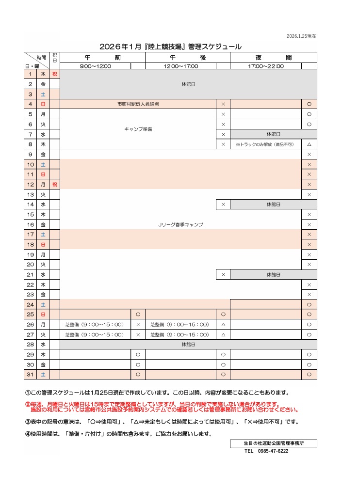 2026年1月『陸上競技場』管理スケジュールが更新されました。